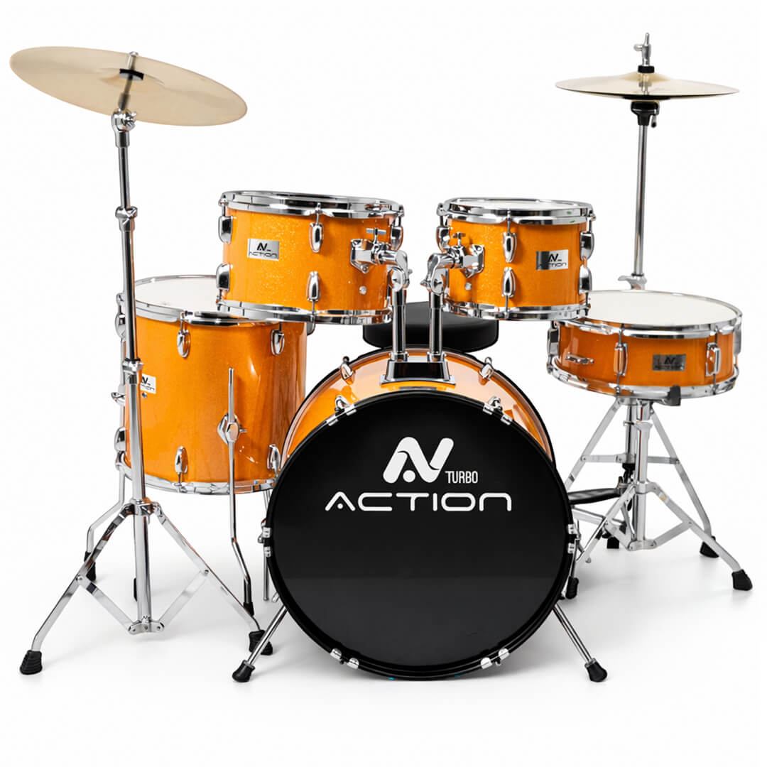 A Bateria Turbo Action 22" Amarelo Sparkle (Laranja) oferece impacto visual, potência sonora e uma estrutura reforçada. Um kit completo para músicos que querem destaque e confiança em qualquer situação musical.